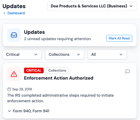 Live notifications for IRS account activity.